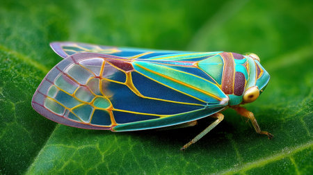 Vibrant leafhopper on green leaf rainbow wings intricate details