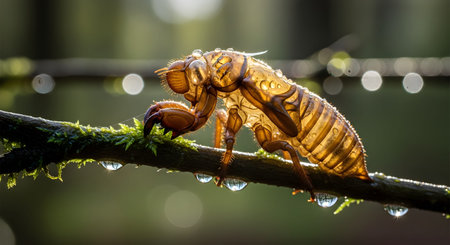 A close-up macro shot of a golden-brown cicada shell clinging to a mossy branch, adorned with glistening water droplets. Backlit by soft sunlight, the image highlights the translucent texture of the exoskeleton and the serene forest atmosphere.