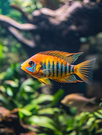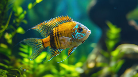 A close-up captures a vibrant fish swimming in a freshwater aquarium. The fish showcases a pattern of blue and yellow scales, set against green aquatic plants. The composition uses selective focus. Suitable for diverse applications, it can be used for projects about aquatic life or nature.