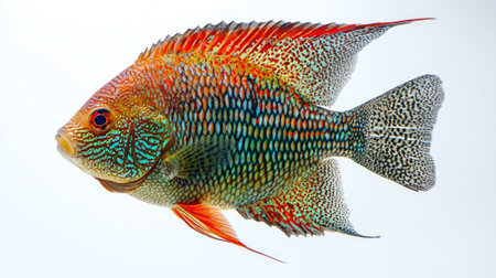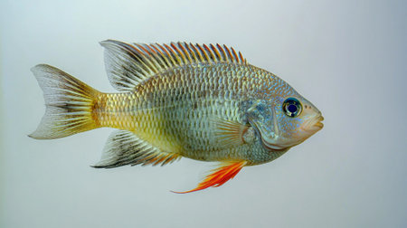 Tilapia a freshwater fish species showcases its vibrant colors and distinctive features as it swims gracefully against a clean white background.