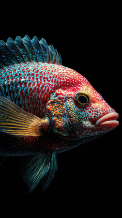 A close-up view presents a colorful tropical fish with a mix of red, blue, and yellow hues. The fish, showcasing detailed scales, is set against a solid black background. The lighting highlights the textures and color variations, suggesting potential uses in illustrations and educational materials, as well as decorative purposes.
