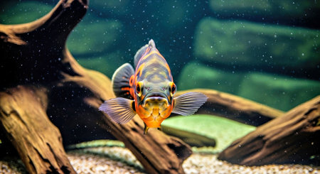 Curious Oscar Fish Observing Camera from Mid Tank Position Captivating Aquarium Life