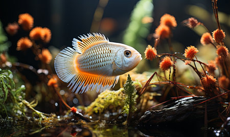 Multi colored fish swimming in freshwater pond, close up of animal eye generated by artificial intelligence
