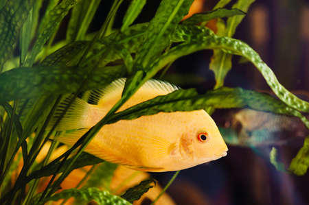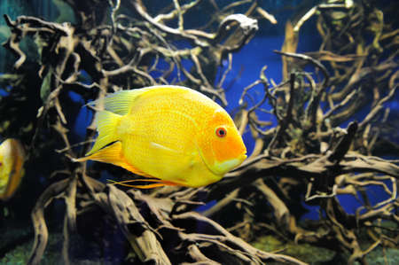 Heros severus floats in a home aquarium among algae. A big yellow fish.