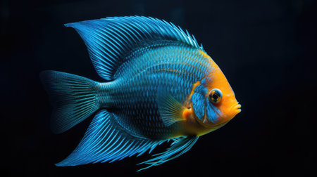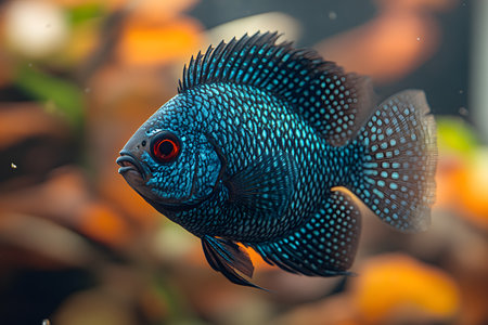 Close-up of a vibrant blue cichlid swimming in an aquarium. its scales glisten under soft lighting, showcasing intricate patterns in a serene aquatic environment with blurred backgrounds its vivid colors. Generative AI