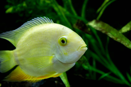 Portrait of freshwater cichlid fish (Andinoacara sp.) in aquarium