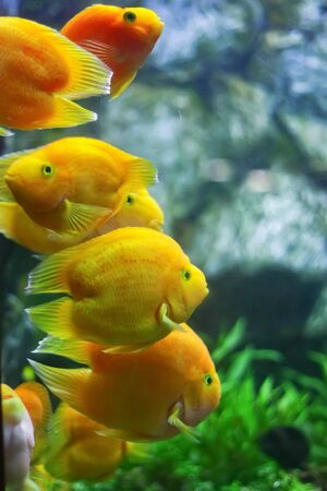 yellow, orange fish Red parrot cichlid parrot swims in aquarium, fish care, blue background, underwater world, slow motion