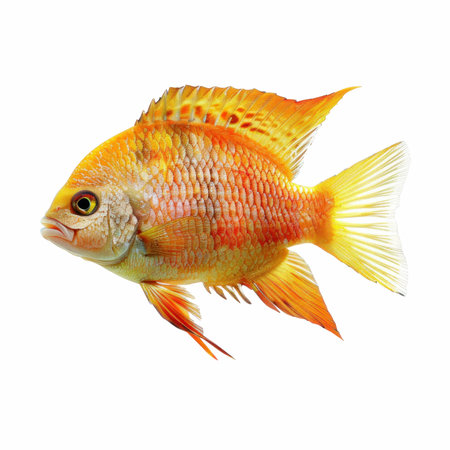 Tilapia a freshwater fish species showcases its vibrant colors and distinctive features as it swims gracefully against a clean white background.