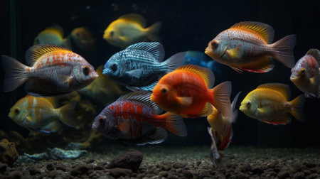 Group of colorful fish swimming in an aquarium. Generative AI
