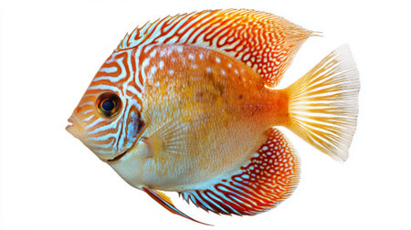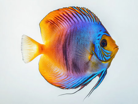 discus fish displays stunning colors and unique patterns perfectly positioned against a white backdrop highlighting its beauty and natural grace for aquarium enthusiasts.