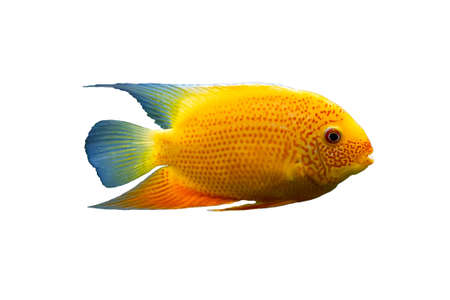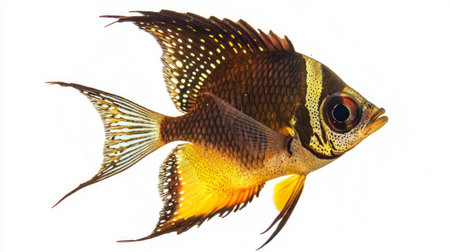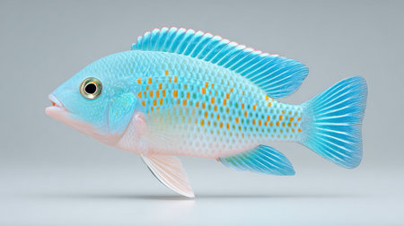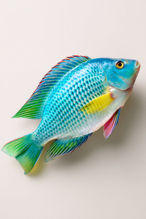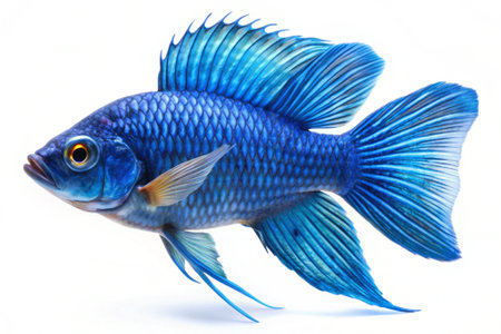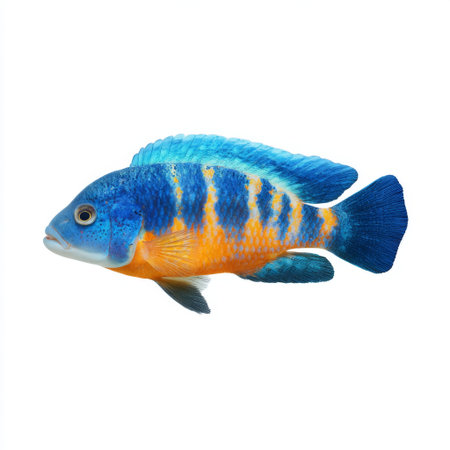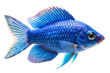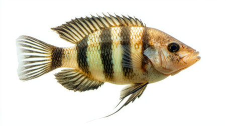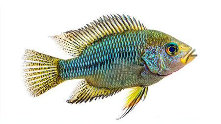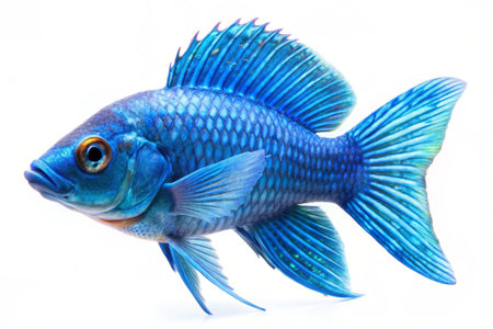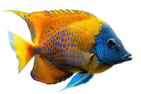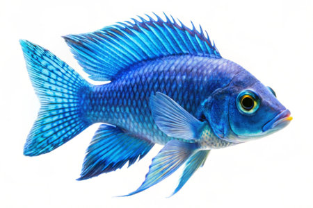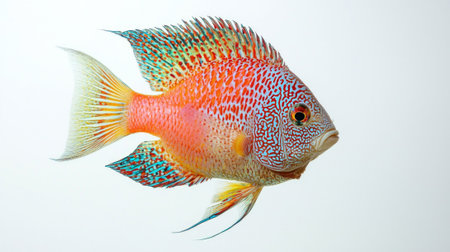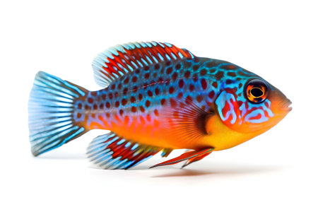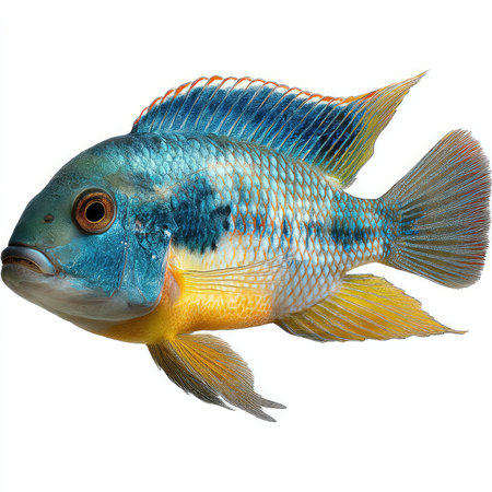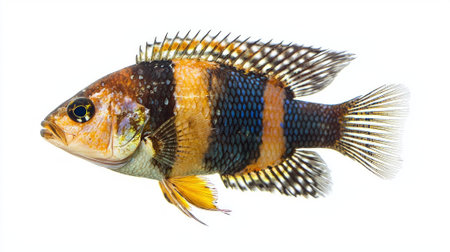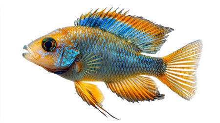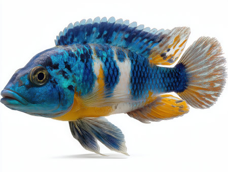 This image features a stunning cichlid fish isolated against a white background, highlighting its vibrant colors and intricate scale patterns. Perfect for educational and commercial use.