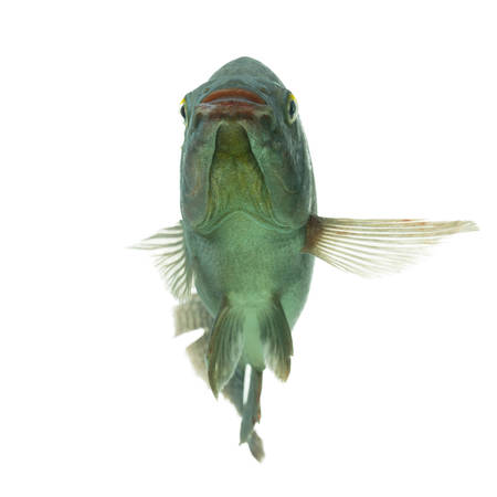 mozambique tilapia, funny pose, studio aquarium shot isolated on white