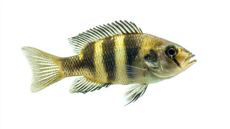 Convict Cichlid displays its striking black and yellow stripes highlighting its vibrant colors and unique features in this isolated setting.