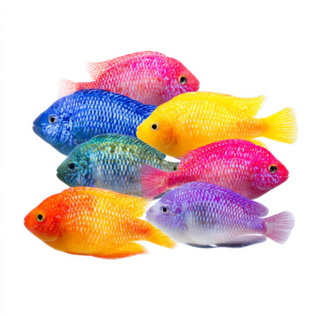 A vibrant assortment of colorful tropical fish in bright hues like pink, blue, yellow, and orange, perfect for aquatic-themed projects and educational use.