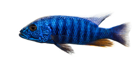 Side view of an Electric Blue Hap, Sciaenochromis ahli, isolated on white
