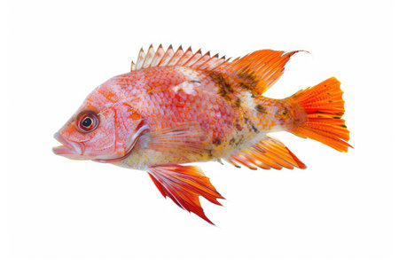 This image showcases a freshly caught fish displayed on a vibrant orange background, highlighting the intricate details of its fins and body texture. Perfect for illustrating seafood themes.