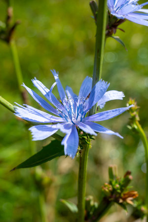 Blue chicory flower during flowering in a close up field. The concept of a caffeine substitute.