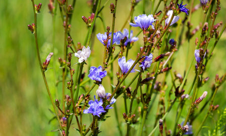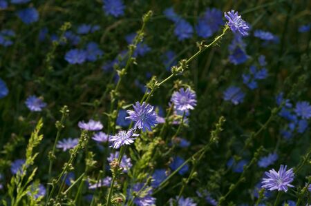 Blooming chicory stems in morning sunshine at summer meadow. This blue wildflower is used for alternative coffee drink. Wild flowers and green grass at background. Soft focus with bokeh. Copy space.