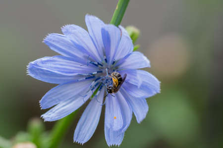 One bee collects nectar on light blue chicory flower. Summer meadow flower Common chicory, Cichorium intybus, wild chicory on background of green grass. close-up. copyspace. selective focus.