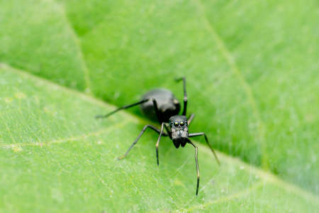 Black beetle perched on vibrant leaves, showcasing intricate details and textures. Nature and entomology concept with green background.