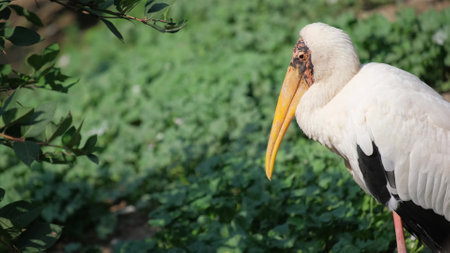 White stork closeup in park in the meadow