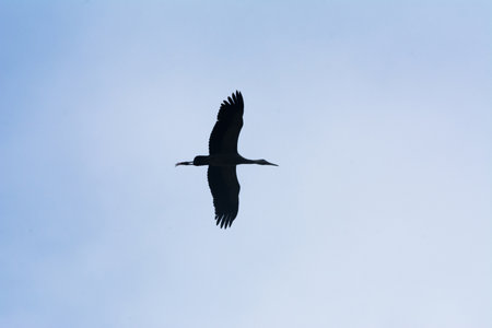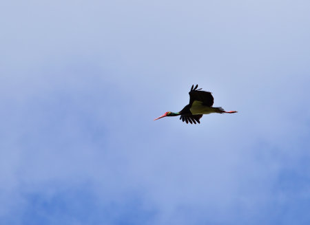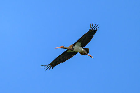 A Black Stork in flight on a sunny day in springtime, blue sky, Lower Austria