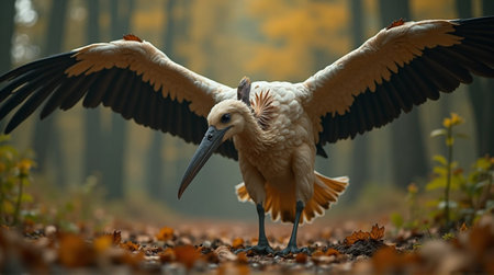 A light ivory bird is spreading its dark wings on a ground covered with golden leaves, set against a blurred autumn forest, evoking a surreal and tranquil atmosphere suitable for nature-themed publications.