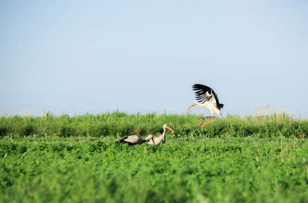 Storks in the green field under sky