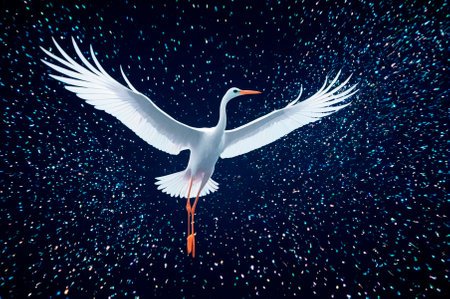 A holographic stork in flight, made up of many particles. Generative AI.
