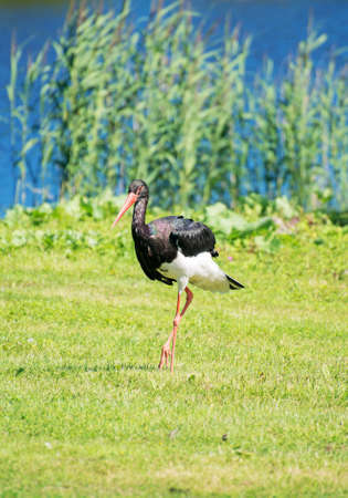Black stork walking in national park. Ciconia nigra.