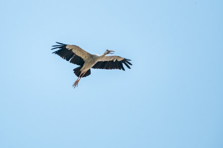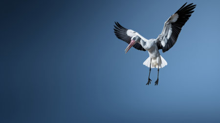 a graceful stork soars in the blue sky