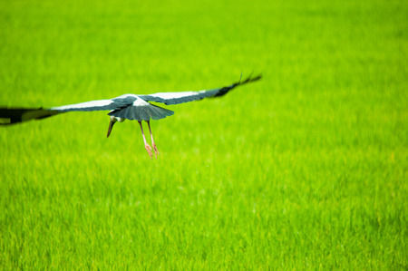 Little white egret has a slow flight on the rice green field in cultivation period of thailand