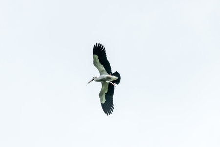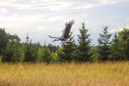 White stork. Ciconia ciconia bird flying outdoors in countryside