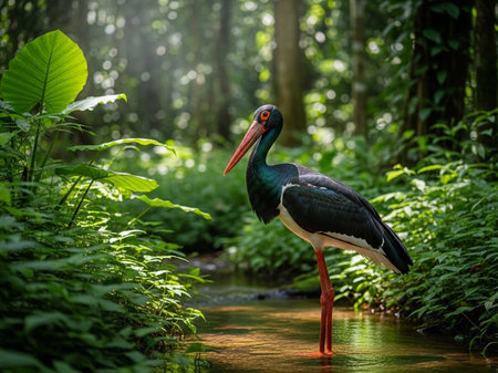 Black necked stork in a natural pond in the rainforest