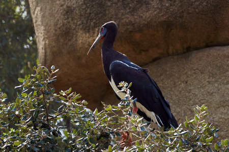 A beautiful side portrait of Abdim's stork on a branch of a tree in a zoo in Valencia, Spain