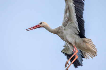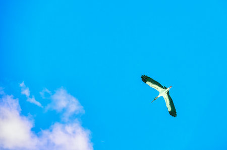 The white stork (Ciconia ciconia), flying with widely spread wings. blue sky. In the Netherlands, Europe.