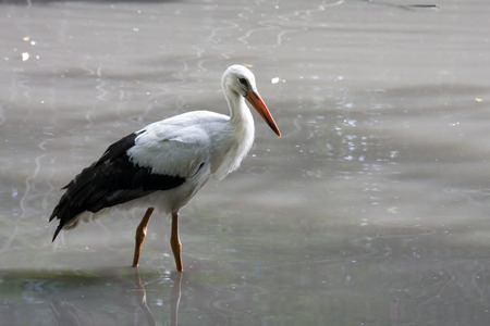 White stork in natural habitat walking and searching for food, Poplar tree forest flood area on river side, rear stork view, unclean white feathers.