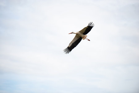 White stork bird (Ciconia Ciconia) flying in the sky.