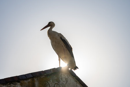 White stork standing on the roof of a house in village. Stork poses for photos. in the countryside in Poland, Europe.
