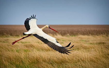 White Stork flying in a blue sky. With large spread wings. Detailed bird. Web banner for social media