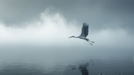 Stork wading in serene misty wetlands at sunrise. That the image is generated using AI.