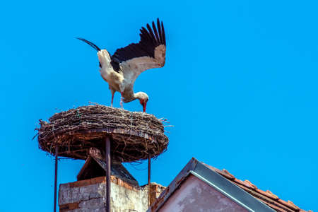 Storks on nest against blue sky, couple of white storks stands at home. Wild stork family living in village or town. Two stork birds on big nest.