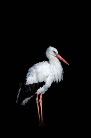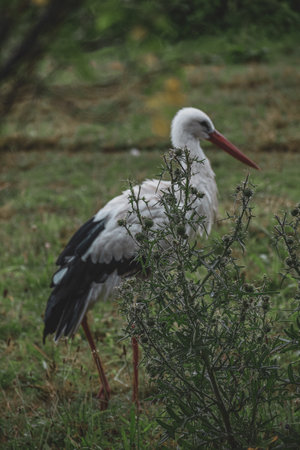 White stork ciconia ciconia the bird is walking in the meadow dawn.