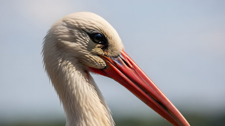 A beautiful stork gazes intently, showcasing its vibrant red beak and intricate feathers.