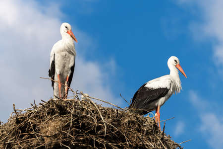 Early spring scene. Storks in a nest with a blue sky in the background.