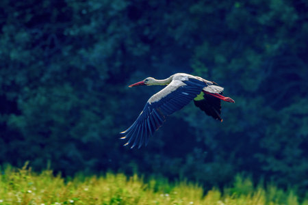 Adult European White Stork Fly Flying Against Green Forest Woods. Ciconia Ciconia.