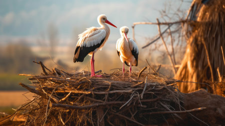 Pair of storks building a nest on a tall tree, their long legs and elegant movements highlighting their unique beauty