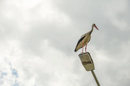 Bottom view of a white stork in a nest on a pillar. An adult stork guards his family, his cubs, his chicks in a large nest of branches.