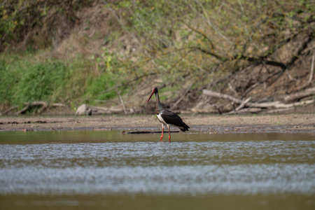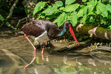 Black stork walking in national park. Ciconia nigra.