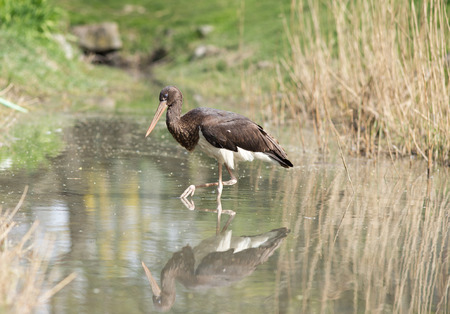 Black stork feeding on pond